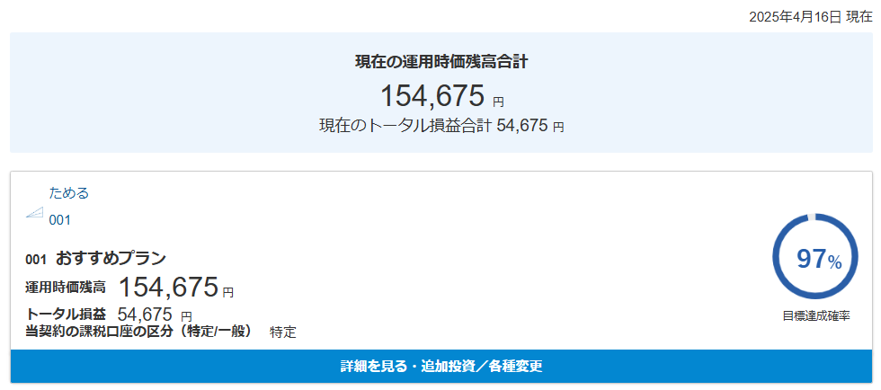 ロボ投資 マネックス証券 ONCOMPASS 運用状況 2025年4月 seama7@gmail.com 2025年4月20日 / 2025年5月15日 63ヵ月が経った今月で+54.68%(年利だと10.41%ペース)。トランプ大統領の関税対策関連で先月から大幅下がりました。長期投資なので目先のことで一喜一憂はダメですが、悪いよりは良い方がやはり気分がいいですね! 最近の調査(2023年11月~2024年11月)ではいい感じですが、トータルはまだまだですね。詳細はこちら Table of Contents Toggle ONCOMPASS 2025年4月現在の資産の推移ONCOMPASS 2025年4月現在のポートフォリオONCOMPASS 2025年4月現在の今後のシュミレーション ONCOMPASS 2025年4月現在の資産の推移 ONCOMPASS 2025年4月現在のポートフォリオ ONCOMPASS 2025年4月現在の今後のシュミレーション マネックス証券 ONCOMPASS 運用状況 2025年3月マネックス証券 ONCOMPASS 運用状況 2025年3月... 最近人気のロボアド投資の直近1年の数字を比べてみました(2023年11月~2024年11月) 直近1年間、2023年11月の残高と2024年11月の残高の差を比べてみました。どのサービスが一番増えたか!? 上昇率トップは投...